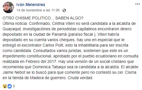 Este rumor se transformó en un «chisme político» tres días después. El usuario Iván Melendez preguntó en redes sociales que tan cierto era que «Cynthia Viteri no será candidata a la alcaldía de Guayaquil«. En esta ocasión la renuncia de la política se debería a que investigaciones de periodistas quiteños encontraron varios cheques depositados por la exasambleísta en la ciudad de Panamá, incluso habría un monto destinado al excontralor Carlos Polit, ahora prófugo de la justicia.
