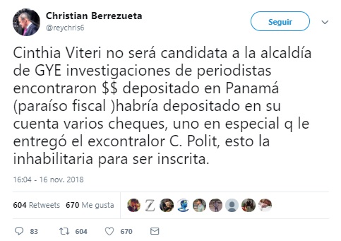 Dos días después el «chisme» se transformó en una afirmación. El usuario de Twitter Christian Berrezueta sostuvo que Viteri no participará en las seccionales de 2019 por depositar dinero en paraísos fiscales, lo cual la inhabilitaría políticamente. El mensaje se transformó en una cadena de WhatsApp que circula desde el 19 de noviembre. Pese a que esta información circula con fuerza en Internet, la actividad política de la excandidata presidencial no se ha visto interrumpida.