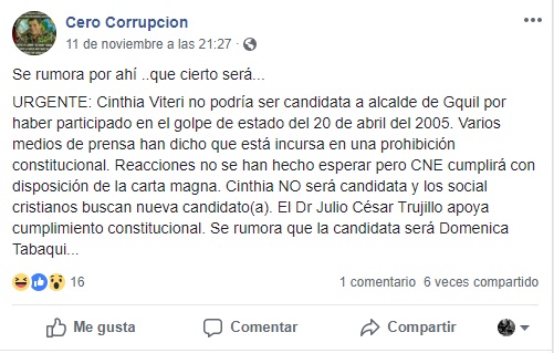 Desde el 11 de noviembre de 2018 se han difundido rumores en torno a la renuncia de Cynthia Viteri a la contienda electoral por la alcaldía de Guayaquil. La cuenta de Facebook ‘Cero Corrupción’ publicó información sobre un «rumor» en el que se afirmó que la política ecuatoriana no podrá participar en los comicios seccionales debido a que «participó en el golpe de Estado del 20 de abril del 2005″, lo cual la inhabilitaría políticamente.