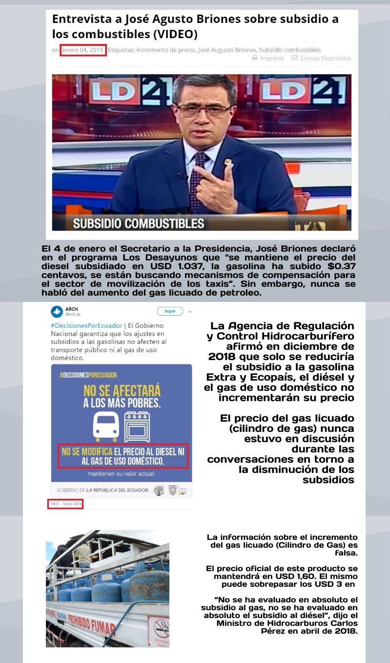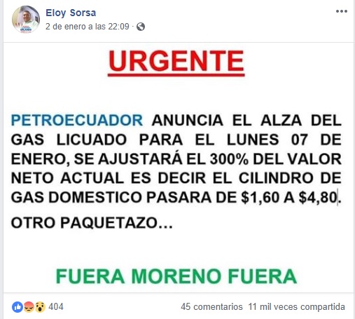Esta publicación compartida por el usuario de Facebook Eloy Sorsa el 2 de enero de 2019 no es cierta. En el mensaje se afirmó que el gas licuado de petroleo, y por ende el gas de uso doméstico, aumentaría de precio a partir del 7 de enero del 2019. Pese a que el Gobierno anunció en diciembre del año pasado la reducción de los subsidios para el combustible Extra y Ecopaís, representantes del Ejecutivo afirmaron que dicha medida no alcanzaría al gas licuado de petroleo.