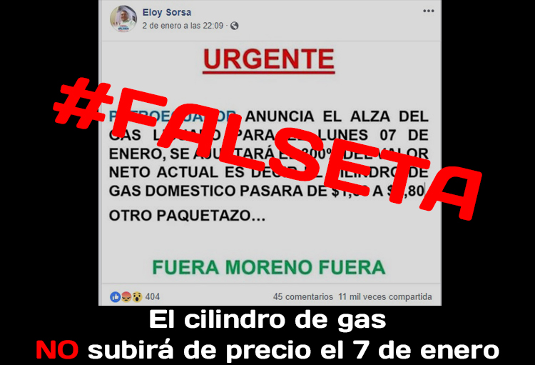 Esta publicación compartida por el usuario de Facebook Eloy Sorsa el 2 de enero de 2019 no es cierta. En el mensaje se afirmó que el gas licuado de petroleo, y por ende el gas de uso doméstico, aumentaría de precio a partir del 7 de enero del 2019. Pese a que el Gobierno anunció en diciembre del año pasado la reducción de los subsidios para el combustible Extra y Ecopaís, representantes del Ejecutivo afirmaron que dicha medida no alcanzaría al gas licuado de petroleo.