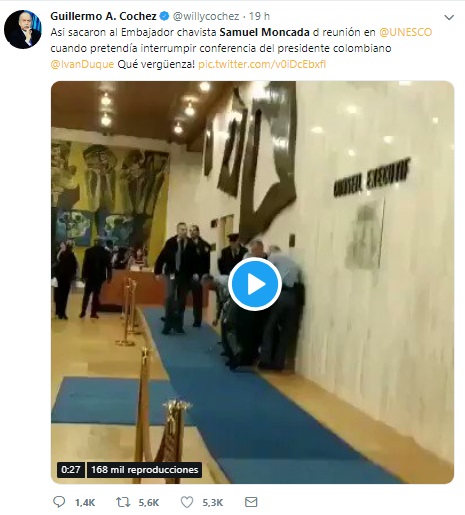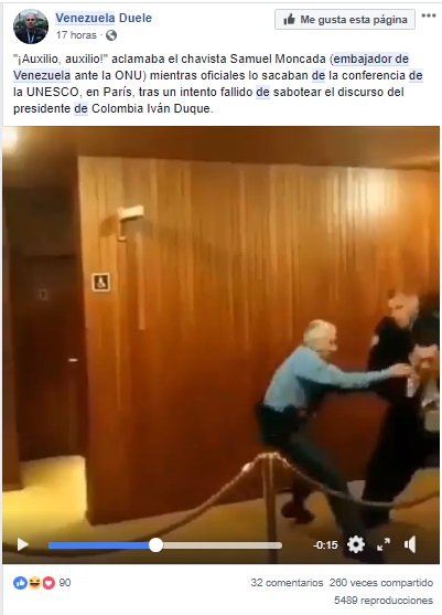 El 14 de noviembre se publicó en redes sociales un vídeo en el que se muestra a guardias de seguridad sacando a la fuerza a una persona de la sede de Organización para la Educación, la Ciencia y la Cultura (Unesco) en París. En el post se afirma que el embajador venezolano ante la OEA Samuel Moncada fue expulsado del evento tras un fallido intento por interrumpir el discurso del presidente colombiano Iván Duque. En Facebook esta publicación alcanzó más de 200 compartidos, y en Twitter 5.600 retuits. La información fue difundida de forma imprecisa.