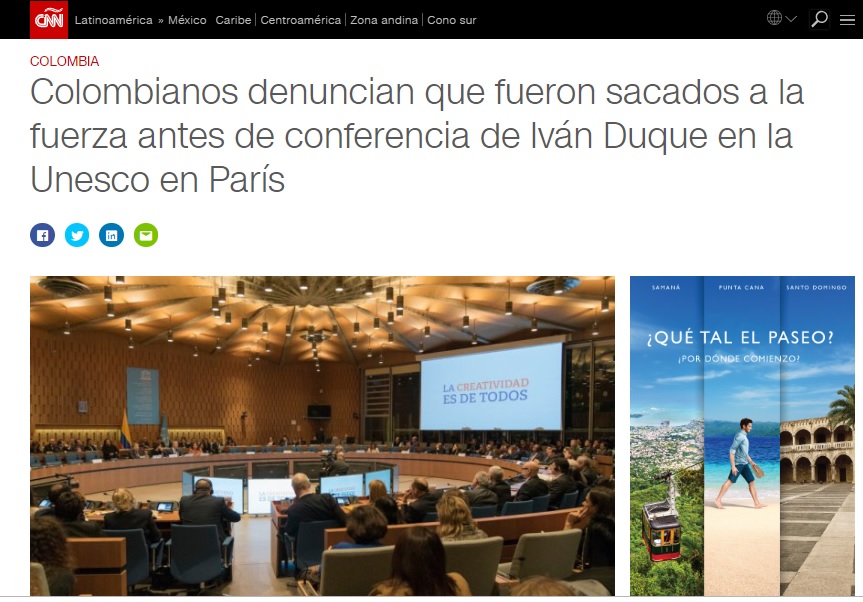 Pese a que el hecho es real, el embajador de Venezuela ante la OEA Samuel Moncada no está involucrado. El 12 de noviembre de 2018 el presidente de Colombia Iván Duque participó en una conferencia en la sede de Unesco en París. Antes de que la intervención del primer mandatario colombiano inicie dos sujetos fueron sacados a la fuerza por la seguridad del evento, las personas expulsadas afirmaron ser de nacionalidad colombiana en medio del forcejeo por su expulsión.