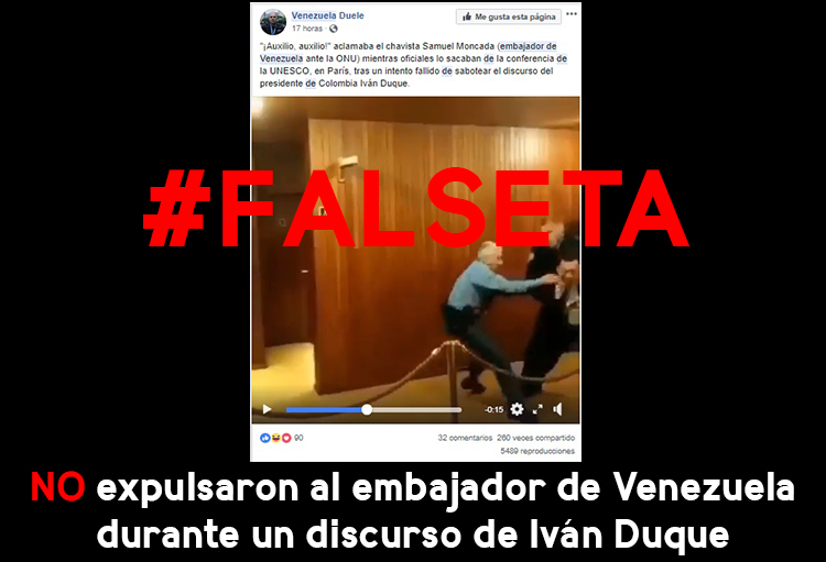 El 14 de noviembre se publicó en redes sociales un vídeo en el que se muestra a guardias de seguridad sacando a la fuerza a una persona de la sede de Organización para la Educación, la Ciencia y la Cultura (Unesco) en París. En el post se afirma que el embajador venezolano ante la OEA Samuel Moncada fue expulsado del evento tras un fallido intento por interrumpir el discurso del presidente colombiano Iván Duque. En Facebook esta publicación alcanzó más de 200 compartidos, y en Twitter 5.600 retuits. La información fue difundida de forma imprecisa.