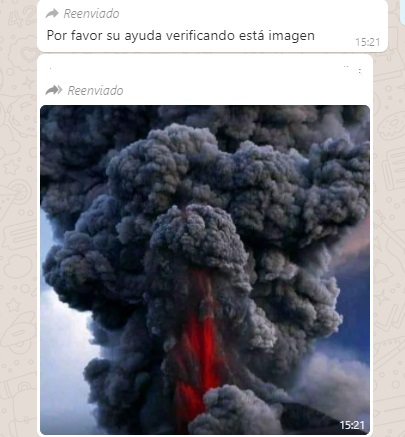 Como suele suceder los fenómenos naturales se convierten en una fuente de desinformación, esta no fue la excepción. Tras las primeras alertas por la ceniza volcánica se viralizó la imagen de un volcán erupcionando con una columna de ceniza y magma imponente. Sin embargo, la imagen estremecedora no corresponde a la erupción del volcán ecuatoriano.