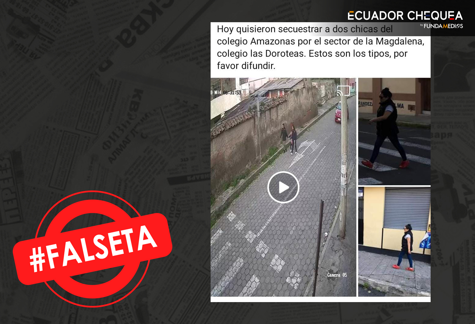 El miércoles 8 de enero de 2020, la imagen de la izquierda fue capturada por una cámara de seguridad en el sector La Magdalena, en el sur de Quito, muy cerca del colegio Amazonas. Las imágenes son reales, pero el teniente coronel de la Policía Nacional, Henry Ponce, confirmó a Ecuador Chequea que fue un intento de robo a las estudiantes por parte de dos antisociales. Además, recalcó que no existió tentativa de secuestro, de acuerdo a las investigaciones.