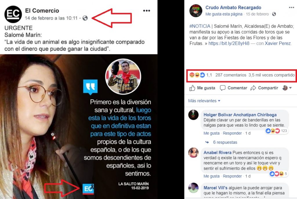 El 15 de febrero de 2019 la página de Facebook Crudo Ambato Recargado publicó una imagen atribuida a Diario El Comercio en la que se afirma que la actual vicealcaldesa y candidata a la reelección del cabildo de Ambato por el partido Avanza, Salomé Marín, afirmó que «primero es la diversión sana y cultural, luego es la vida de los toros que en definitiva están para estos actos».