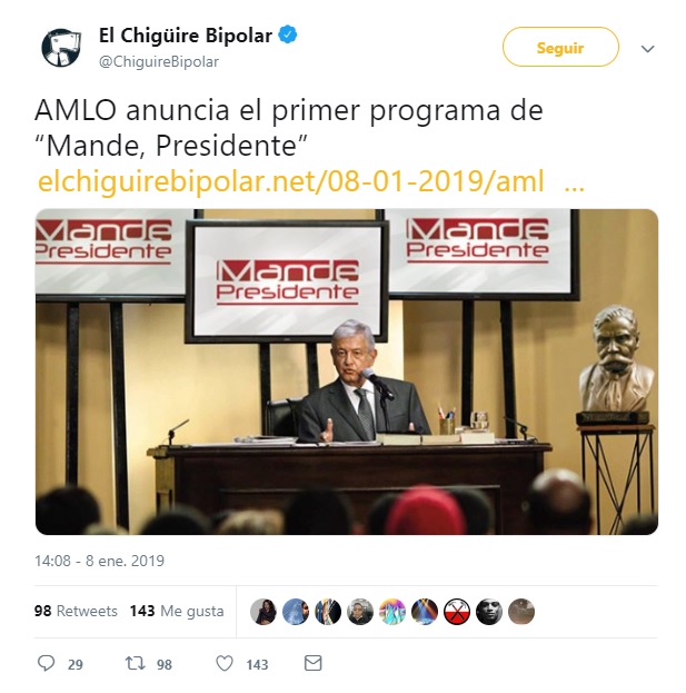 El 1 de diciembre de 2018 Manuel López Obrador (AMLO) tomo posesión como presidente de México. Sin embargo, su ascenso al sillón presidencial mexicano no estuvo exento de contenido falso en redes sociales. Así, el 8 de enero de 2019 el usuario de Twitter @ChiguireBipolar publicó una nota afirmando que el primer mandatario mexicano anunció la emisión inaugural de su programa «Mande, Presidente». En la nota que acompañó el post se detalló que el exjefe de Gobierno del Distrito Federal abrió el espacio televisivo con la finalidad de «mostrar diariamente la realidad de su país».