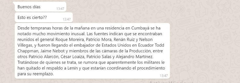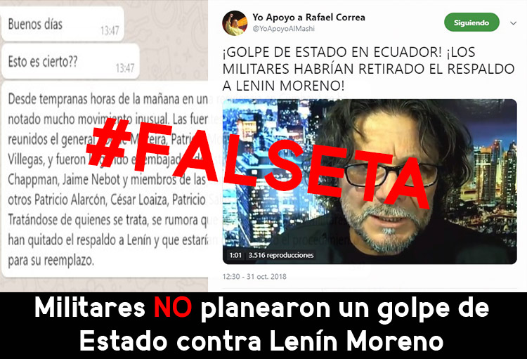 Un mensaje que se difunde a través de WhatsApp desde el 30 de Octubre afirma que altos mandos militares, representantes empresariales y políticos se reunieron en Cumbayá (Quito) para planear un golpe de Estado en contra del presidente Lenín Moreno. En el mensaje se nombran funcionarios como: Roque Moreira, comandante general del Ejercito, Patricio Mora, comandante general de las Fuerzas Aéreas, Renan Ruiz, contralmirante de la Marina, Nelsón Villegas, comandante general de la Policía Nacional, Jaime Nebot, alcalde de Guayaquil, Todd Chapman, embajador de Estados Unidos en Ecuador, entre otros.