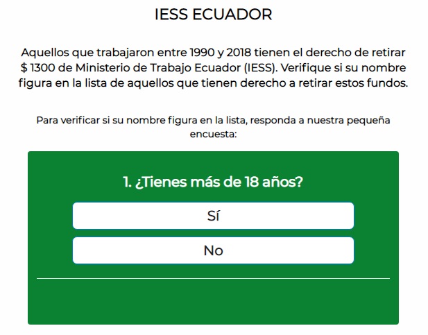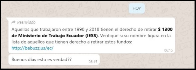 Desde la primera semana de enero circula en WhatsApp una cadena afirmando que las personas que trabajaron entre 1990 y 2018 tienen derecho a retirar USD 1.300 del Ministerio de Trabajo Ecuador. De acuerdo al mensaje, el único requisito para acceder a este beneficio es entrar a la dirección http://bebuzz.us/ec/ para verificar si su nombre figura en la lista de aquellos que tienen derecho a retirar estos fondos. Pese a que el mensaje fue compartido por varios usuarios a través de WhatsApp, el director de comunicación del Ministerio del Trabajo, Michel Adum, confirmó que el post es falso y que no tiene ninguna relación con la institución.