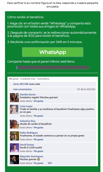 Tras concluir la encuesta, el servidor te conduce a un supuesto chat en el que distintas personas afirman haber recibido el beneficio económico, y te invitan a clickear el botón de color verde con la palabra WhatsApp para «compartir esta promoción con todos sus amigos». Sin, embargo el enlace no conduce a ninguna página oficial.