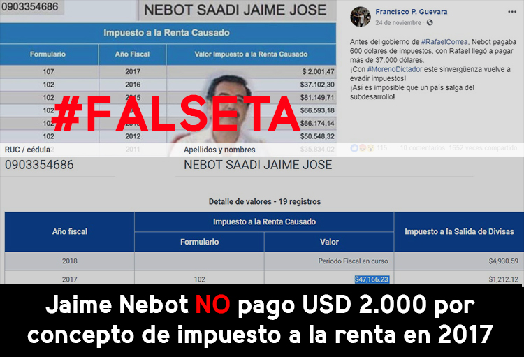 De acuerdo al Servicio de Rentas Internas (SRI) en el 2017 Jaime Nebot declaró USD 47, 166 por concepto de impuesto a la renta. En el post falso las cifras del impuesto a la renta y la salida de divisas causado por el líder del Partido Social Cristiano (PSC) coinciden hasta el 2016. Sin embargo, en la publicación difundida a través de redes sociales se afirmó que en 2017 el político pagó USD 2.001 por impuesto a la renta, USD 45.000 menos de lo señalado por el portal oficial del SRI. El aumento del pago del impuesto a salida de divisas concuerda con el incremento progresivo de esa tasa impositiva fijado durante la gestión de Rafael Correa.
