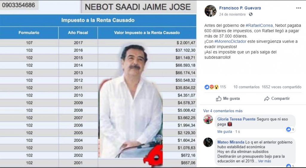 A través de nuestro WhatsApp nos solicitaron verificar la veracidad de esta información. En la cuenta de Facebook Francisco P. Guevara se publicó el 24 de noviembre un post donde se aseguró que antes del gobierno de Rafael Correa, el alcalde de Guayaquil, Jaime Nebot pagaba USD 600 en impuestos. Cuando el exmandatario ecuatoriano llego al poder esta cantidad subió a más de USD 37.000. Sin embargo, durante el el Gobierno de Lenín Moreno el exgobernador del Guayas volvió a evadir impuestos. El mensaje concluye afirmando que esta situación no permite que el país salga del subdesarrollo.