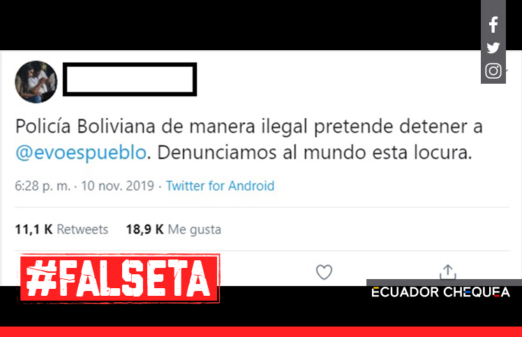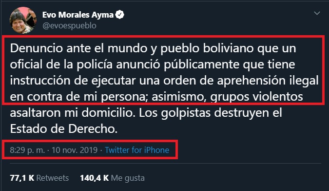 Dos horas después, el mismo Morales denunció en su cuenta Twitter que un «policía de Bolivia había anunciado su detención ilegal». El político afirmó que se estaba vulnerando el estado de Derecho en este país latinoamericano.