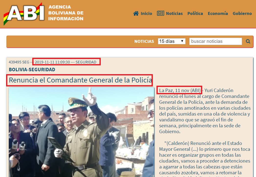 La mañana de este lunes 11 de noviembre, la Agencia Boliviana de Información, órgano oficial informativo del Estado Boliviano, confirmó la renuncia del comandante de la Policía de Bolivia, Yuri Calderón.