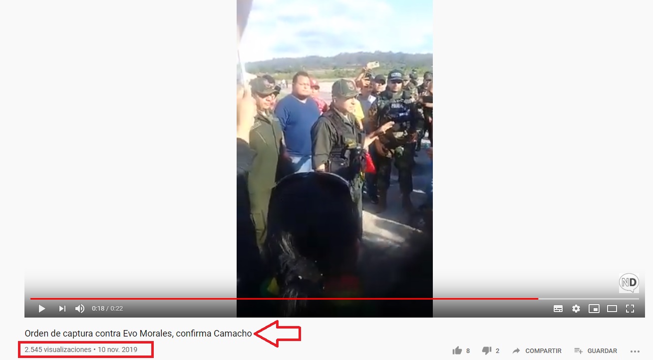 Esa misma noche, se viralizó un video en que un oficial de Policía boliviano comunica a varias personas que protestan en contra de Morales que «la orden del general Vladimir Yuri Calderón, comandante de la Policía de Bolivia, es detener al expresidente». Los presentes vitorearon y en redes sociales se desató una ola de desinformación.