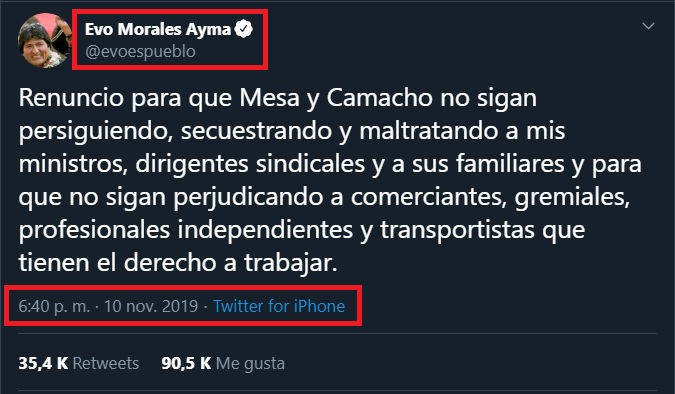 Tras 18 días de protestas Evo Morales renunció a la presidencia de Bolivia el 10 de noviembre a las 18:40 horas de La Paz. A través de Twitter el líder político confirmó su renuncia y denunció acciones violentas cometidas en contra de sus ministros y dirigentes sindicales para forzar su salida.