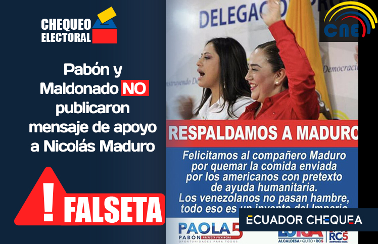 Las elecciones seccionales de marzo han generado contenidos falsos en relación a diferentes temas, uno de ellos es la crisis sociopolítica de Venezuela. Desde el 23 de febrero se compartió en la cuenta de Facebook ‘El Granadero’ una imagen en que se afirma que Luisa Maldonado y Paola Pabón, candidatas a la Alcaldía de Quito y Prefectura de Pichincha respectivamente, manifestaron su apoyo al régimen de Nicolás Maduro. El mensaje incluye una foto de la campaña desarrollada por las militantes del Movimiento Fuerza Compromiso Social, afín al expresidente Rafael Correa.