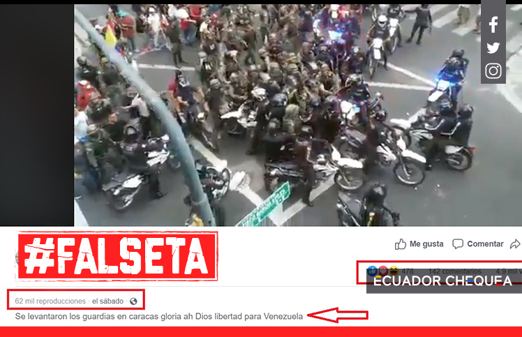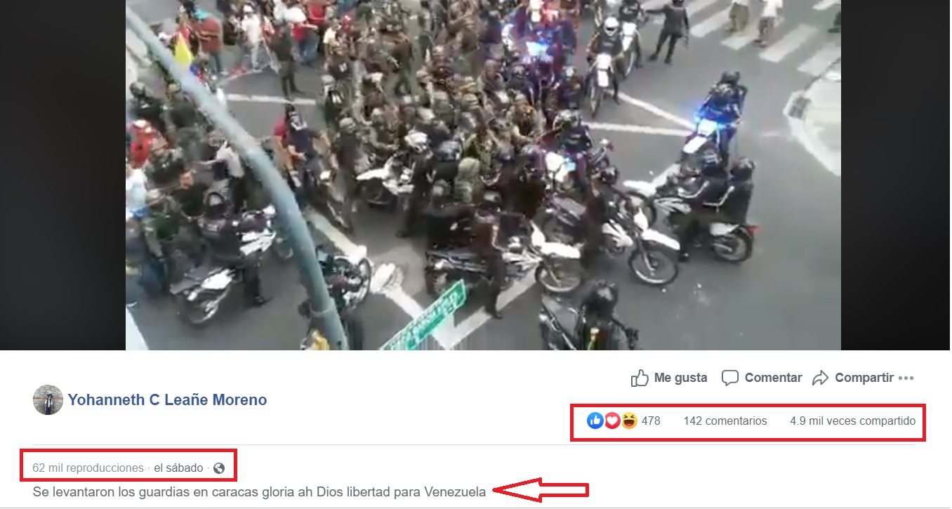 Contenido falso en torno a lo ocurrido circula desde entonces. Este video en que policías y militares tienen una pelea se compartió acompañado del mensaje: «Se levantaron los Guardias en Caracas, gloria a Dios, libertad para Venezuela». La publicación fue compartida casi 5.000 veces en menos de tres días.