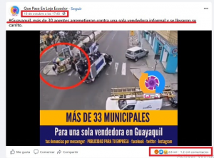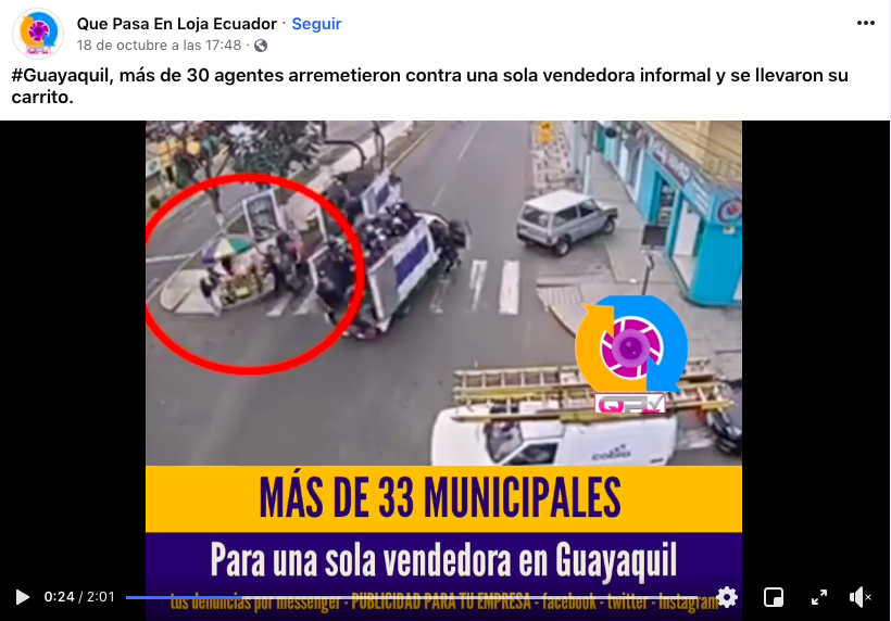 En el texto del video publicado se asegura que “más de 30 agentes arremetieron contra una sola vendedora informal y se llevaron su carrito”. La publicación obtuvo más de 1.200 comentarios y registró 2.600 interacciones desde el 18 de octubre hasta este 27 de octubre. La gran mayoría de personas dieron por cierto que el hecho se produjo en Guayaquil.