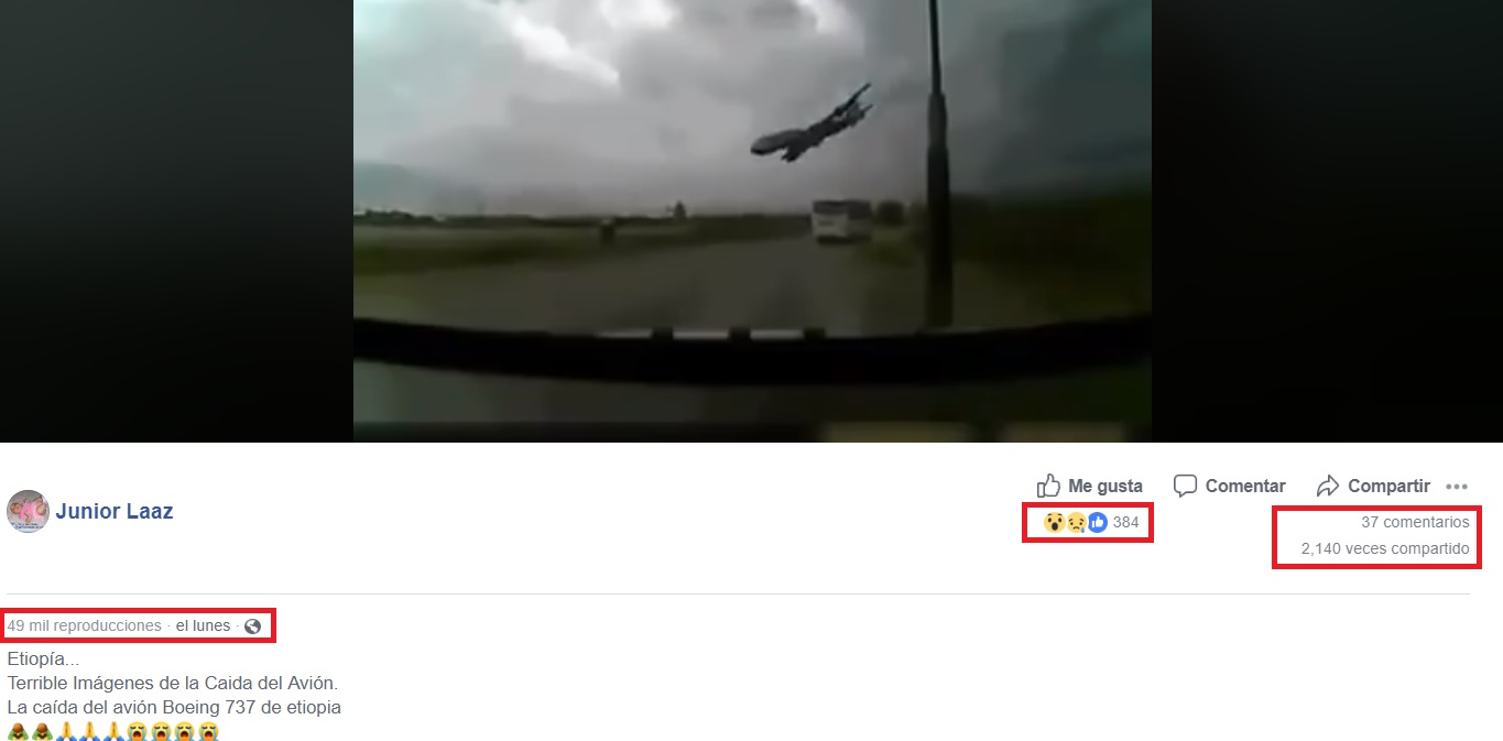Tras el accidente, se difundió a través de Facebook un video en el que una nave se estrella y se afirma que corresponde a la tragedia en Áfriza. La publicación, realizada el lunes 18 de marzo, tiene más de 49 mil reproducciones, 2.000 compartidos y 300 interacciones.