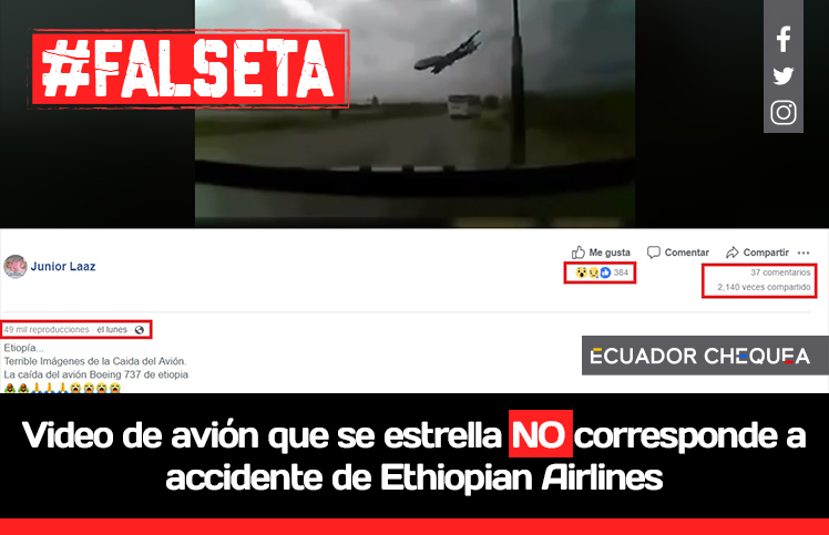 El avión del video no pertenece a la línea aérea etiope, ni se trata del accidente donde murieron 157 personas de más de 30 nacionalidades.