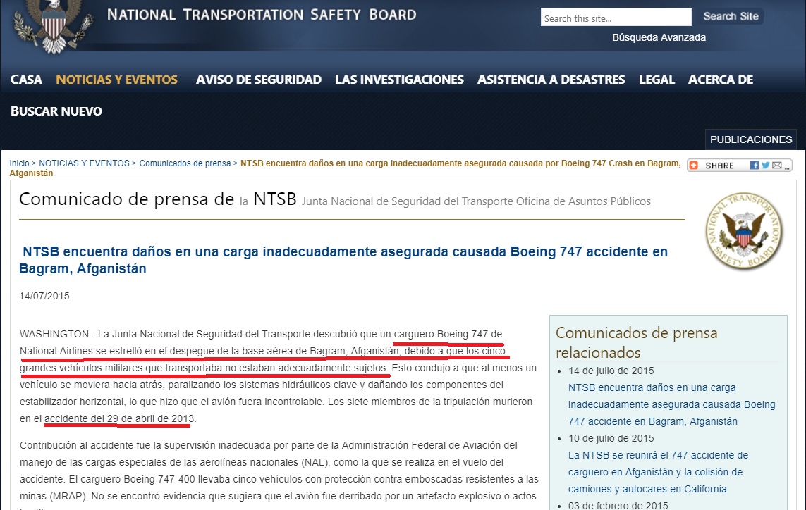 La Junta Nacional de Seguridad del Transporte descubrió que un carguero Boeing 747 de National Airlines se estrelló en el despegue de la base aérea de Bagram, Afganistán, debido a que los cinco grandes vehículos militares que transportaba no estaban adecuadamente sujetos. Esto condujo a que al menos un vehículo se moviera hacia atrás, paralizando los sistemas hidráulicos clave y dañando los componentes del estabilizador horizontal, lo que hizo que el avión fuera incontrolable. Los siete miembros de la tripulación murieron en el accidente del 29 de abril de 2013.