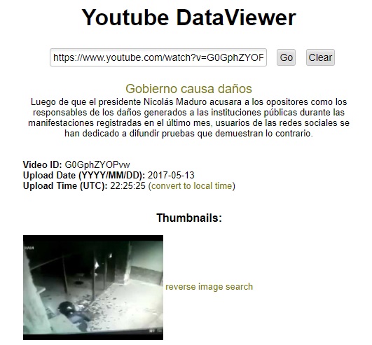 A través de la herramienta Youtube DataViewer, desarrollada por Amnistía Internacional, se determinó que el audiovisual data del 13 de mayo de 2017. Fue publicado en el canal de YouTube del diario venezolano El Tiempo.
