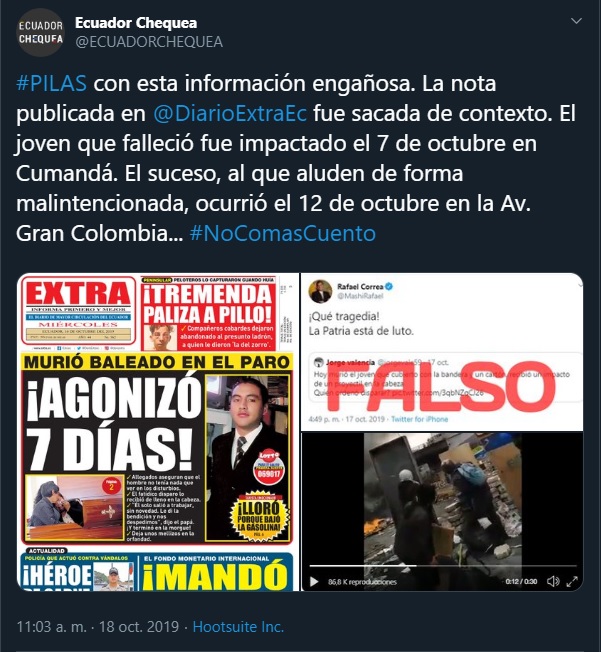 Sin embargo, la información fue sacada de contexto por el Diario Extra, debido a que el joven que falleció por un impacto de bala ocurrió el 7 de octubre en la ciudadad de Cumandá y no tiene nada que ver con el herido del video, hecho que ocurrió el 12 de octubre en la ciudad de Quito.