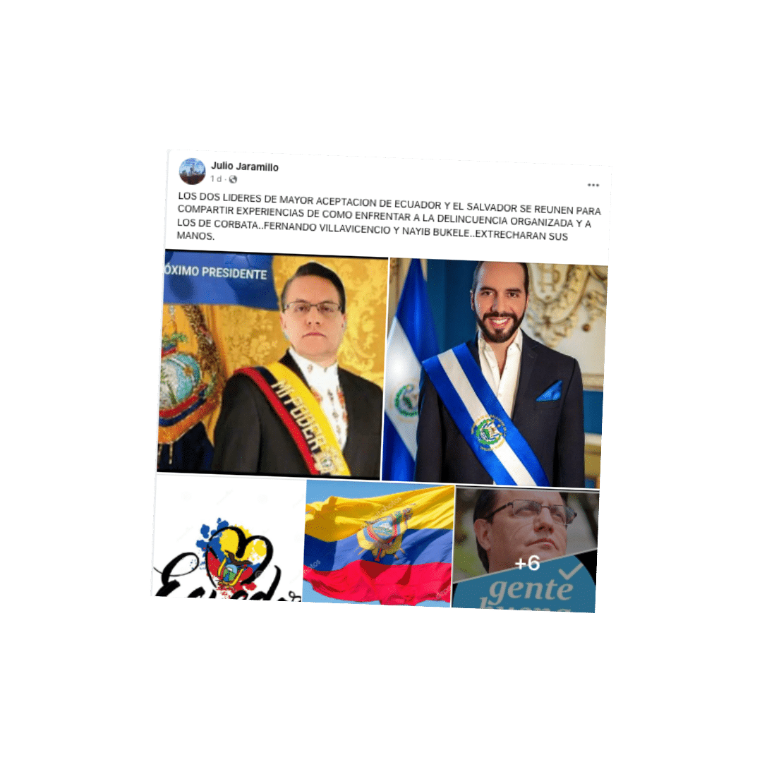 Una publicación en Facebook asegura que el asambleísta Fernando Villavicencio será el próximo Presidente del país. En la publicación se afirma que Villavicencio y Nayib Bukele, presidente de El Salvador, son los dos líderes de mayor aceptación de sus países y que se reúnen para compartir experiencias de cómo enfrentar a la delincuencia organizada.