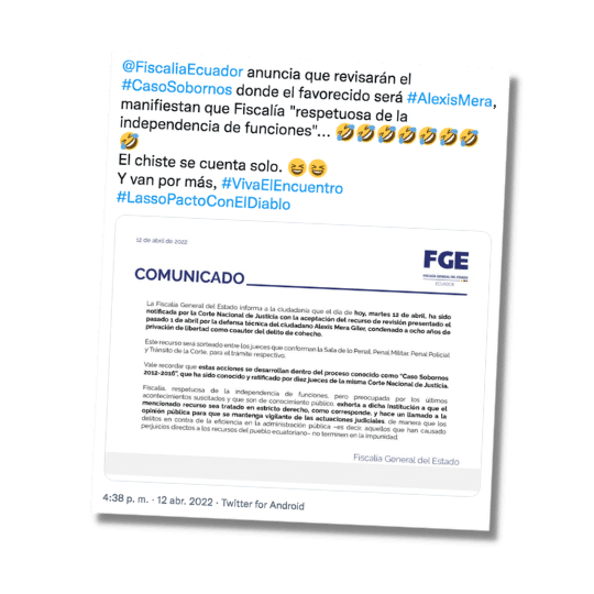 El domingo pasado, Jorge Glas salió de la cárcel gracias a un cuestionado hábeas corpus otorgado por un juez de Manglaralto. Con esta información, una cuenta de Twitter publicó que la Fiscalía anunció que revisarán el caso de Alexis Mera, también sentenciado por este caso. Esto es cierto. La Fiscalía comentó que fue notificada por la Corte Nacional de Justicia con la aceptación del recurso de revisión de Mera.