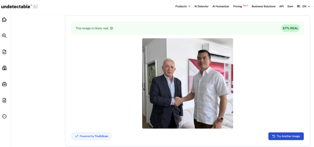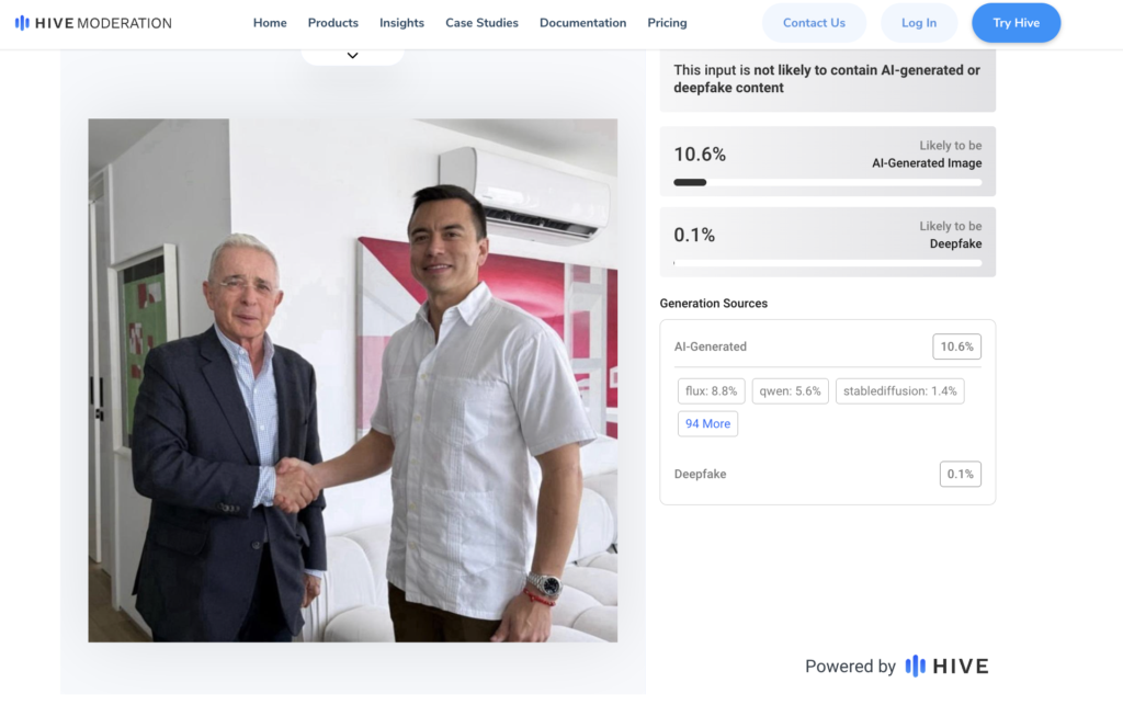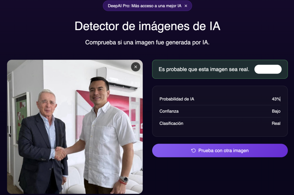 - Lo que afirma: Que la imagen probaría una reunión reciente entre Uribe y Noboa, previa al alza arancelaria contra Colombia.