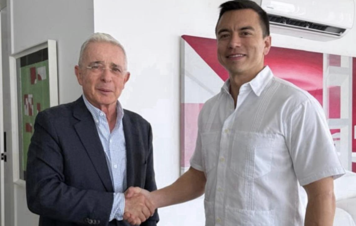 La imagen muestra un apretón de manos entre el presidente ecuatoriano Daniel Noboa y el expresidente colombiano Álvaro Uribe. Circuló en redes sociales entre el 25 y 26 de abril de 2026, en medio de tensiones políticas regionales entre gobiernos de distinto signo ideológico.