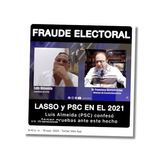 Una publicación en Twitter asegura que hubo fraude electoral provocado entre Lasso y el Partido Social Cristiano (PSC). En el post se menciona que Luis Almeida, asambleísta del PSC, asegura tener pruebas del hecho. La información es falsa. Almeida hizo declaraciones en una entrevista, pero no hay ninguna denuncia formal por fraude y las que fueron presentadas en su momento, ya fueron desechadas. El propio Almeida dijo que es algo que se debe seguir investigando y no aportó pruebas factuales en la entrevista.