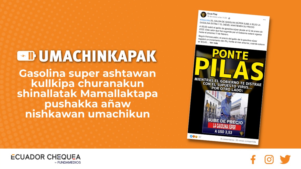 Facebook pankapi churarka gasolina súper $3,53 kullkipak mirachinakun, Mamallaktapa pushakka “añaw nishkawan” umachikun. Chay willayka umachinkapakmi kan. Decreto pankawanmi gasolinapa super mashna katunamantaka mana harkarinchy shinallatak kunanpika 3,52 dólar kullkipami kan; chaymantami 2018 watapi shina sakirirka shinallatak unkuypachawanka mana ima rikuyta charinchu. Kay tukuri killapika unkushkakunaka ashtawanmi mirashka.