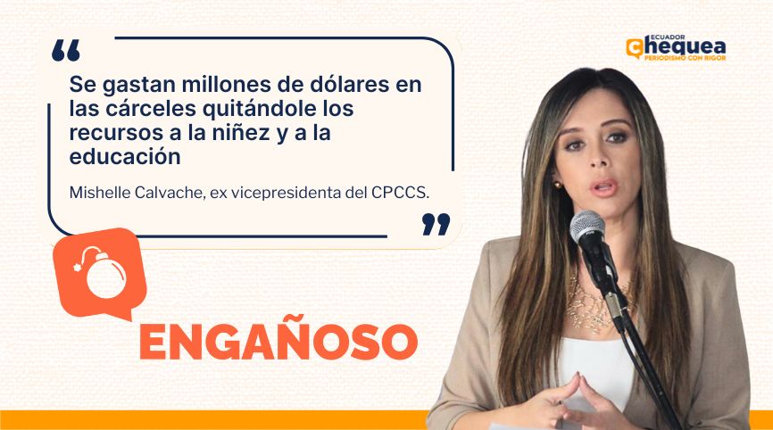 En plena campaña electoral por la consulta popular que busca convocar una Asamblea Constituyente, la exvicepresidenta del CPCCS, Mishelle Calvache, publicó en su cuenta oficial de TikTok un video en el que afirma que “se gastan millones de dólares en las cárceles quitándole los recursos a la niñez y a la educación”. Ecuador Chequea revisó los presupuestos del Gobierno Central 2020–2024 para determinar si el gasto penitenciario ha implicado una reducción en educación o en la atención a la niñez.