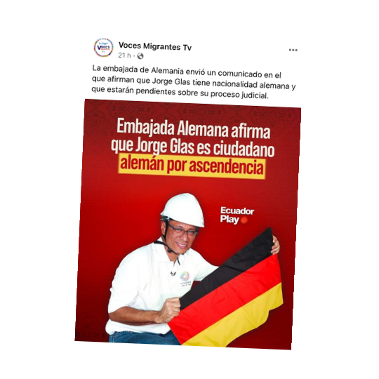 24 pacha puntallatak manarak tantanakuy kakpillatakmi, Alemaniamanta embajadaka Twitter pankapi llukchirka shuk willayta “Jorge Glaska alemaniamantapash kan”nishpa llukchirka.