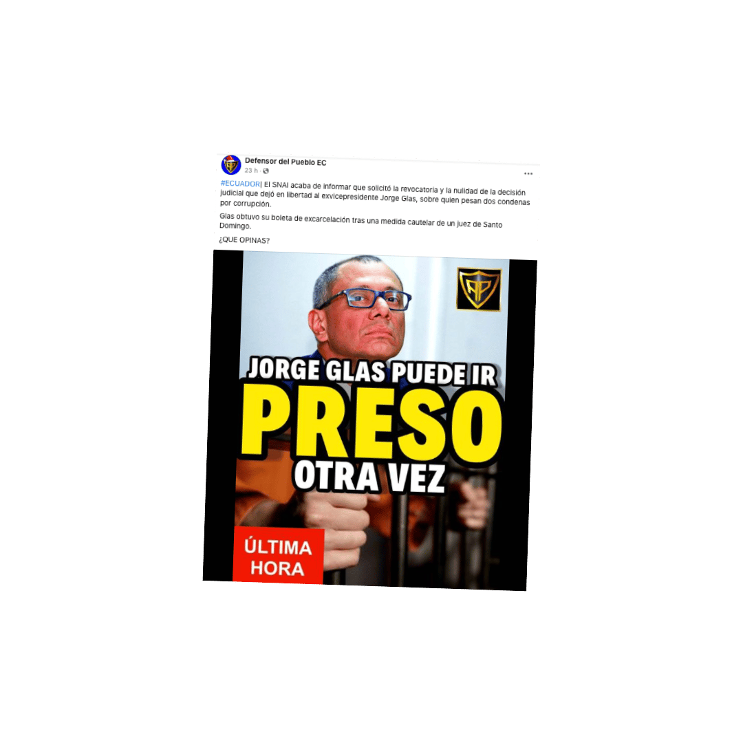 En Facebook circula una imagen que asegura que Jorge Glas podría volver a la cárcel. En la descripción del post se afirma que el SNAI informó que solicitó la revocatoria y la decisión judicial que dejó en libertad al exvicepresidente. La información es cierta.