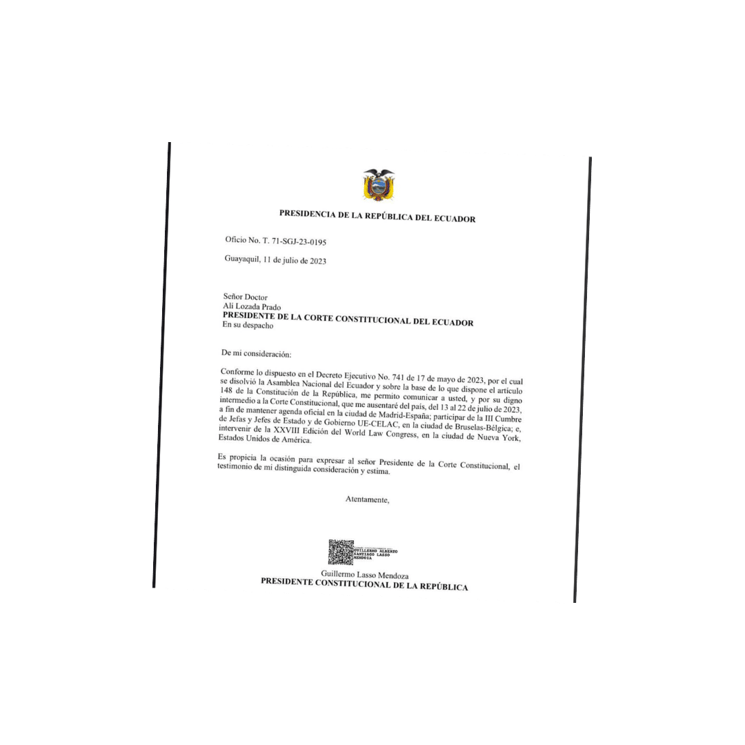 Ayer, 12 de julio de 2023, el presidente, Guillermo Lasso notificó a la Corte Constitucional que se ausentará del país entre el 13 y 22 de julio. El anunció oficial se realizó también a través de las redes sociales de la Secretaría General de Comunicación.