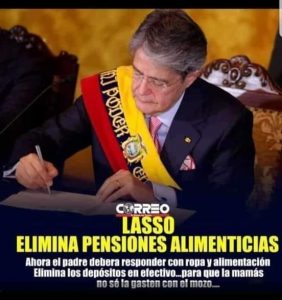 Desde una cuenta personal de Facebook se compartió unapublicación que asegura que el presidente de la República, Guillermo Lasso, habría eliminado las pensiones alimenticias. El contenido presenta una fotografía del Primer Mandatario firmando un documento y señala que ahora quienes “son padres deben responder con ropa y alimentación” y que con ello ya no existirían los depósitos en efectivo. La información es falsa, ya que Lasso no ha firmado ningún decreto que elimine las pensiones alimenticias.