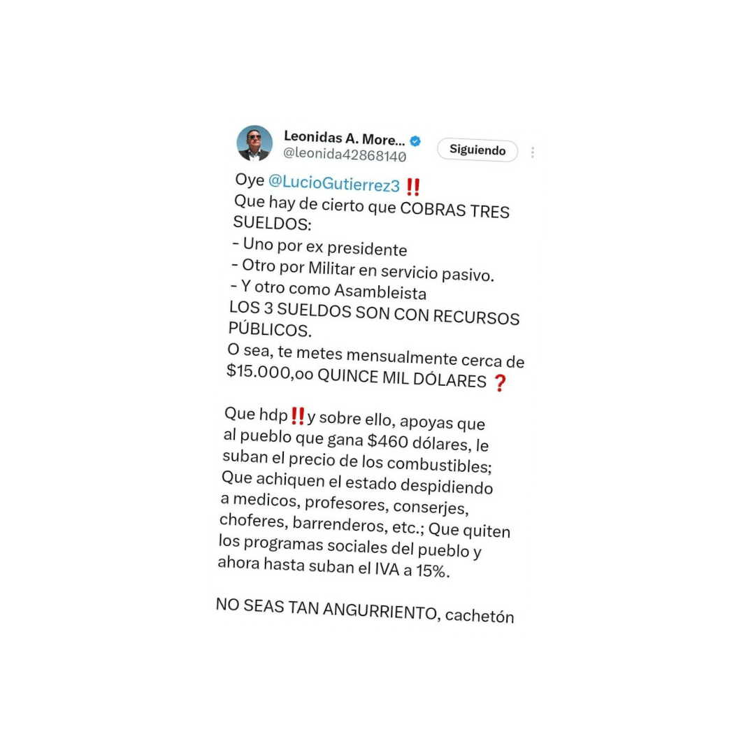 La trayectoria del político ha sido aprovechada por los desinformadores para hacer de las suyas. Una publicación en Facebook asegura que Lucio Gutiérrez recibe 3 sueldos lo que significa que cobra cerca de 15.000 dólares mensuales en total. Se califica este contenido como engañoso. Gutiérrez recibe tres sueldos, pero no suman $15.000 como asegura la publicación. Él tiene una pensión de militar en servicio pasivo, una como expresidente y la tercera como asambleísta. Estas tres cantidades sumadas dan un total de $10.090,63.