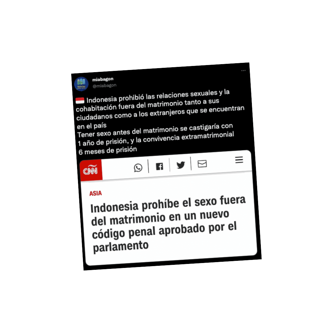 En la red social Twitter circula una publicación que asegura: “Indonesia prohibió las relaciones sexuales y la cohabitación fuera del matrimonio”. Calificamos esta información como cierta. El Parlamento de Indonesia aprobó dichas enmiendas legales.