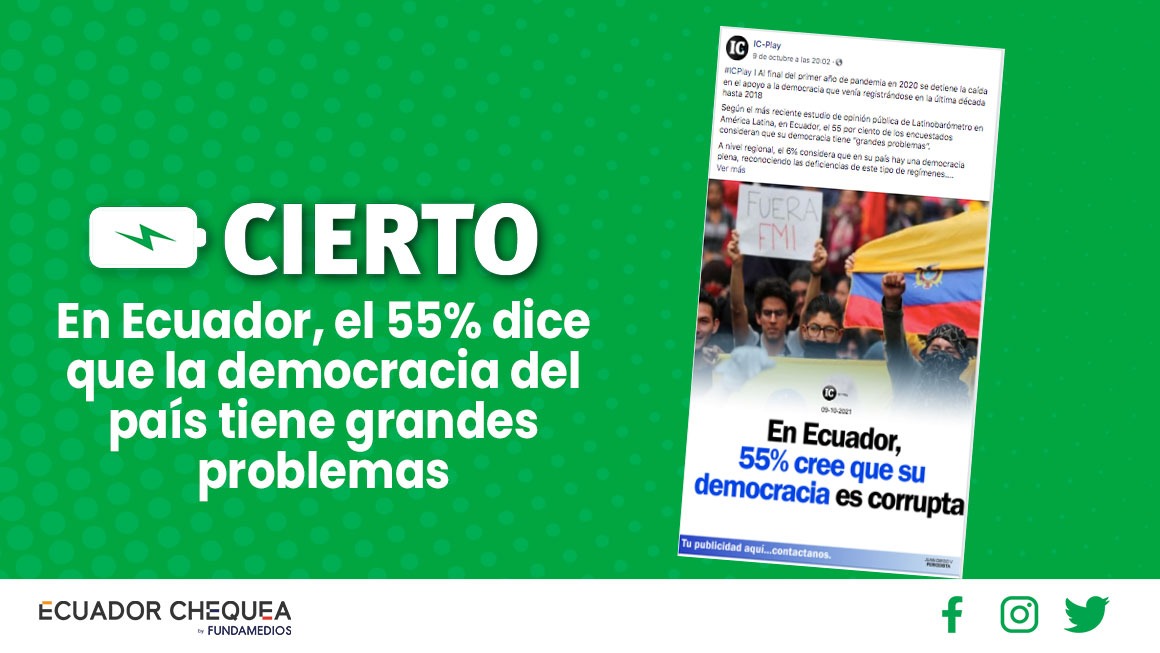 Una página en Facebook publicó que en Ecuador el 55% cree que su democracia es corrupta y que apenas el 6% considera que hay una democracia plena en la región de Latinoamérica. Esto es cierto. Las cifras pertenecen al último informe de Latinobarómetro 2021.