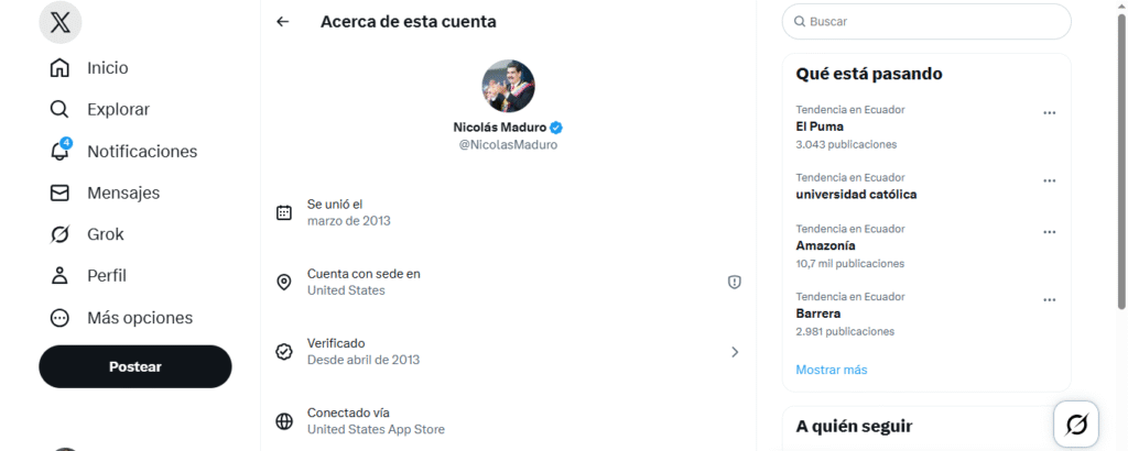 La función “about this account”, introducida por X para mostrar datos técnicos no sensibles, indica que la cuenta de Nicolás Maduro está registrada en Estados Unidos y vinculada a la App Store de ese país, mediante un búsqueda manual, Ecuador Chequea, pudo comprobar lo antes mencionado.