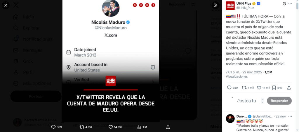 Una publicación en X asegura que la cuenta del presidente de Venezuela, Nicolás Maduro, opera desde Estados Unidos. El argumento central se basa en que la función “acerca de esta cuenta” muestra que el perfil está registrado y se conecta a través de ese país.