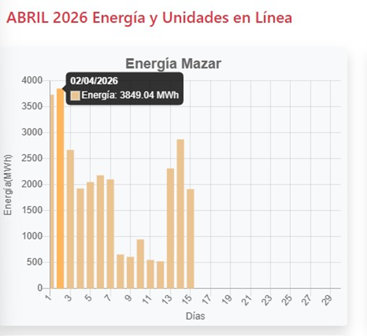 En el caso de Mazar, cuya capacidad máxima diaria es de 4.080 MW (110 MW por hora), el mayor registro reciente fue de 3.849,04 MW el 2 de abril, mientras que posteriormente descendió hasta 2.871,39 MW, por lo que no estuvo “a su tope”.