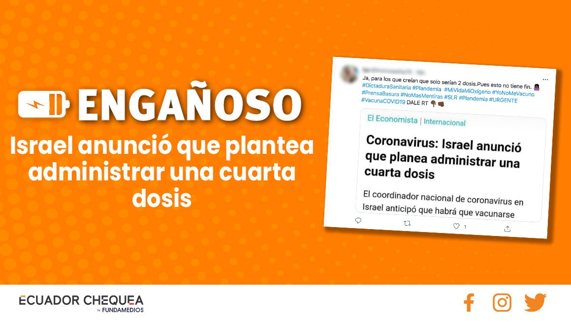 Este 6 de septiembre de 2021, se compartió una publicación en Twitter que asegura que existe una dictadura sanitaria y que no solamente serían dos dosis de la vacuna contra la Covid-19. En este contenido, se adjunta una captura de pantalla que asegura que Israel plantea una cuarta dosis. La información es engañosa, ya que el coordinador para Covid-19 de Israel sí pidió preparativos, pero este país se encuentra ahora colocando recién las terceras dosis.