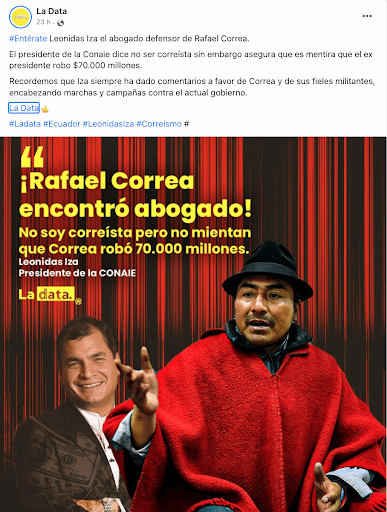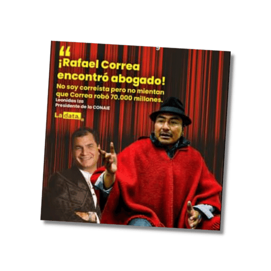 En una publicación de Facebook se asegura que Iza es el nuevo abogado defensor de Correa porque declaró: “No soy correísta, pero no mientan que Correa robó $70.000”. Esta información es engañosa. Pese a que las declaraciones de Iza sí fueron en ese sentido, no fueron textualmente así y tampoco ha sido nombrado abogado del expresidente, sentenciado por corrupción y prófugo de la Justicia, pese a que goza del refugio de Bélgica.