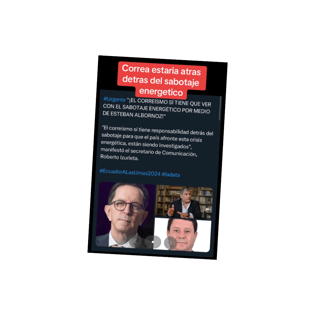 En TikTok circula una foto que asegura que el exsecretario de Comunicación Roberto Izurieta habría dicho: “El correísmo sí tiene responsabilidad detrás del sabotaje para que el país afronte esta crisis energética, están siendo investigados”. Se califica al contenido como engañoso. Izurieta se refirió al tema mientras ejercía su cargo, hace 2 meses.