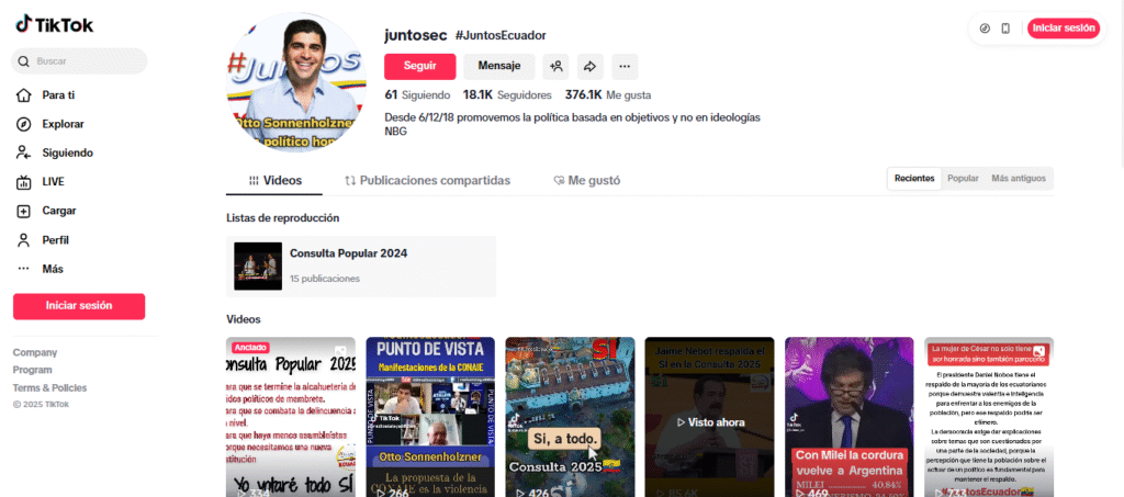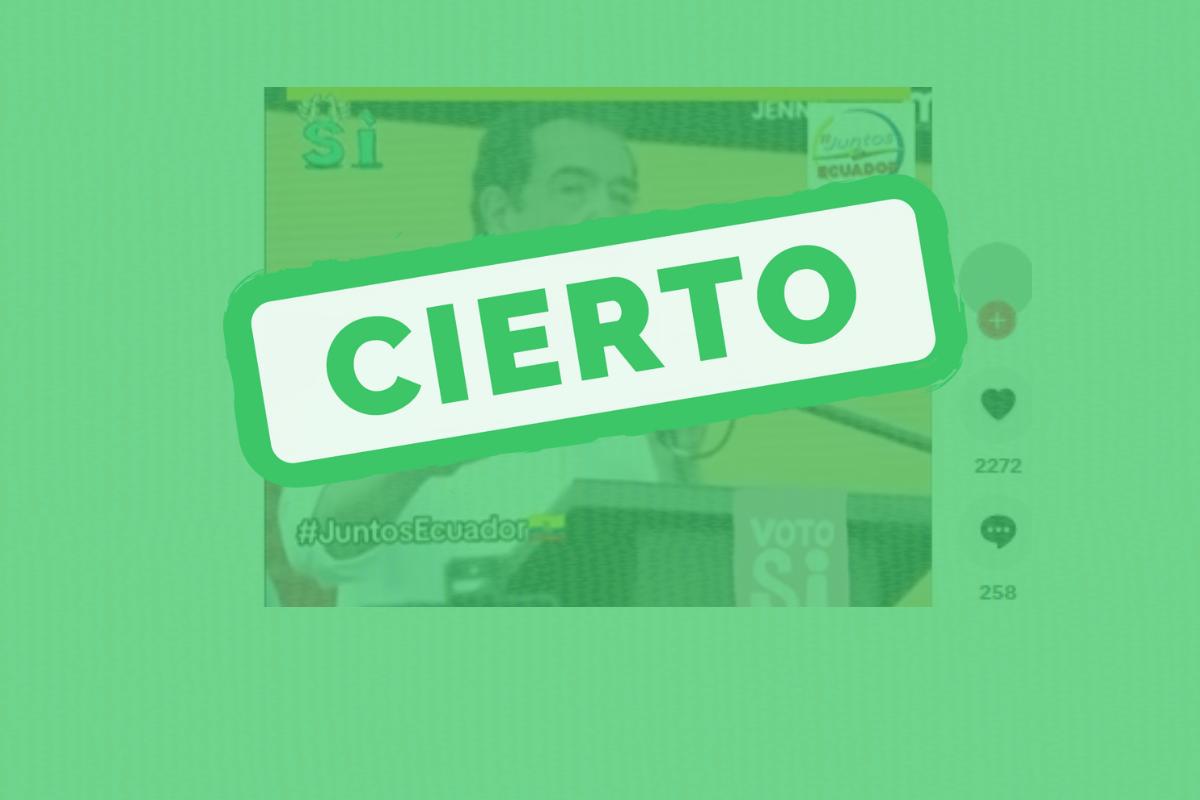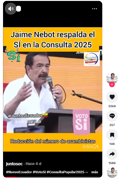 En TikTok se difundió un video que asegura que el exalcalde de Guayaquil, y líder del del Partido Social Cristiano Jaime Nebot, apoyará la Consulta Popular convocada por el presidente Daniel Noboa, para este 16 de noviembre. El video se presenta como una “confirmación” del respaldo del líder socialcristiano al proceso.